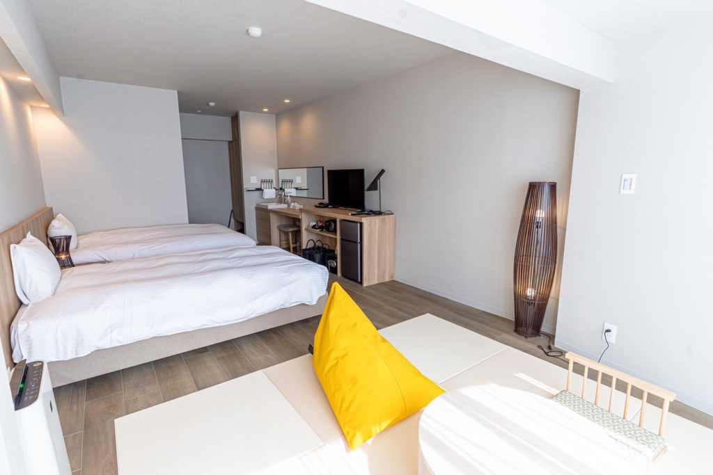 禁煙室/琉球畳の落ち着いた雰囲気の空間とセミダブルベッドⅹ2台でゆったり寛げる和洋室です。